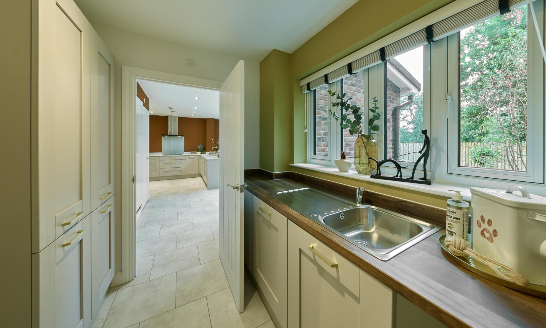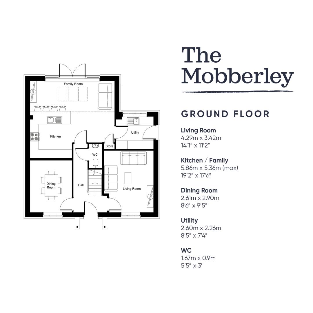 THE MOBBERLEY is a five bedroom detached executive family home, with large open plan kitchen and family room with feature roof light windows and access to the rear garden through French doors. Useful utility room, separate living room and dining room, downstairs WC. Five spacious bedrooms, dressing area to the main bedroom and ensuites to both the main and second bedrooms, two further family bathrooms, storage and and detached double garage.