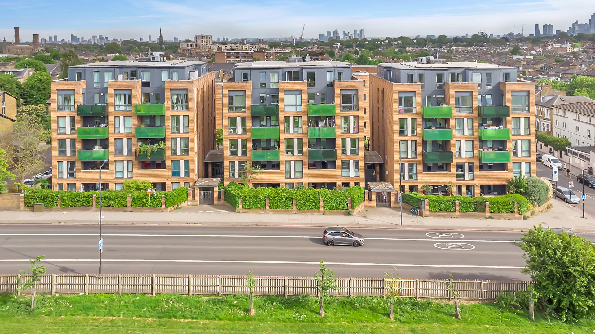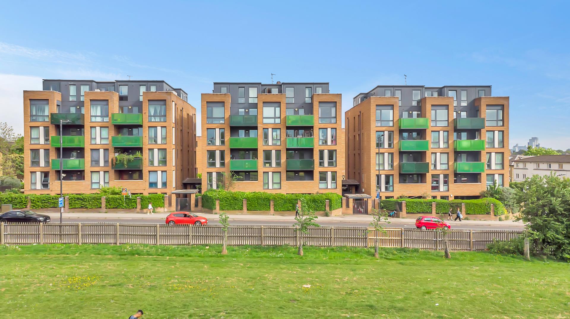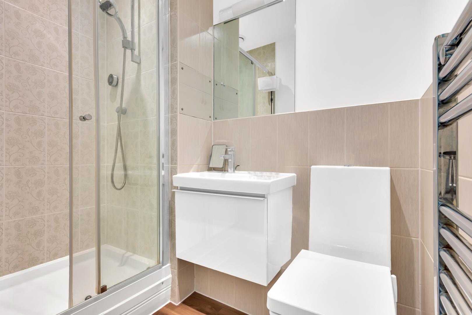 Ahead of the hallway are the three bedrooms. The master bedroom far to the left has the most stunning view of Finsbury Park with two sound proof windows, doorway to the far right leading to the balcony and access to its own en suite which has a towel radiator, wall hanging vanity unit with mirror above and shower enclosure with power shower and a well sized glass/ sliding shower enclosure.