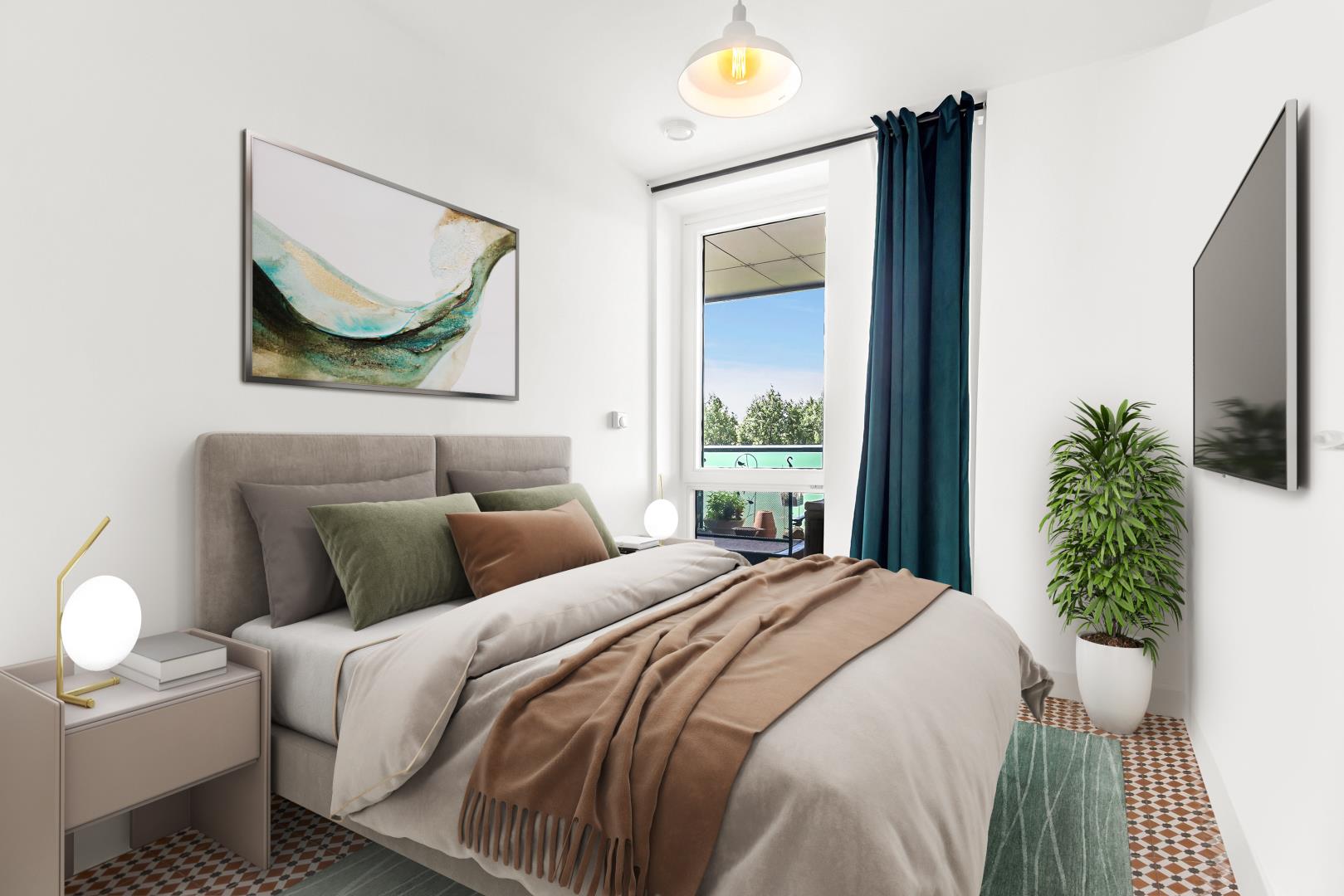 To the right of the turning in the hallway is access to the kitchen and further to left is the second bedroom. This bedroom has a large floor to ceiling window looking onto the park and Victorian style geometric flooring.